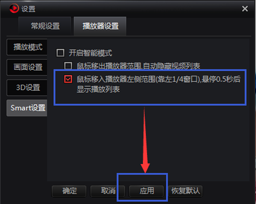 3、可以選擇是否開啟智能模式,鼠標移出播放器范圍,是否自動隱藏視頻列表,鼠標移入播放器左側范圍(靠左1/4窗口),懸停0.5秒后是否顯示播放列表,設置之后,點擊“應用”或者“確定”按鈕保存,點擊“恢復默認”按鈕則可恢復到默認設置。