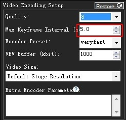 ・Max Key frame Interval關鍵幀間隔。新浪直播要求設置 5.0 否則會出問題