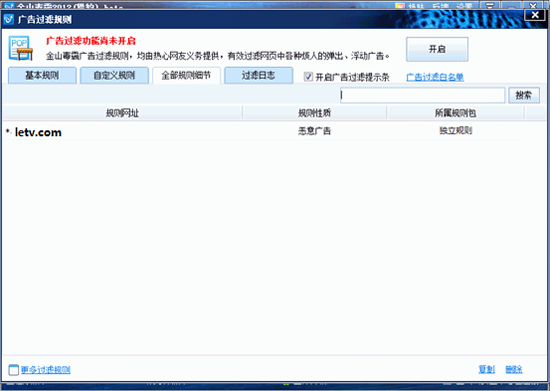 如果您使用的是金山毒霸,請依次點擊金山毒霸中的"百寶箱"——"廣告過濾",然后切換到"全部規則細節"選項卡: