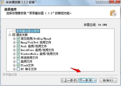 運行安裝文件進入安裝向?qū)В阆霝榇舸舨シ牌靼惭b哪些功能就是媒體關(guān)聯(lián)的文件類型看自己的需要去勾選。