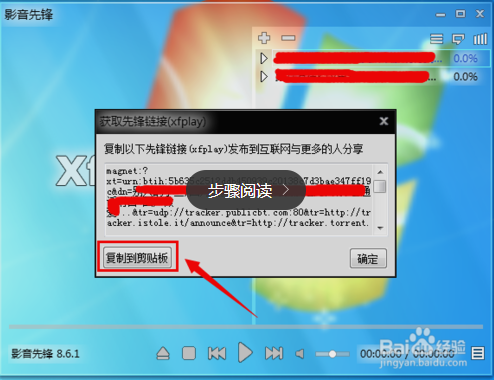從彈出的”獲取xfplay磁鏈“窗口中點擊”復(fù)制到剪貼板“按鈕,以便復(fù)制磁鏈至剪貼板。