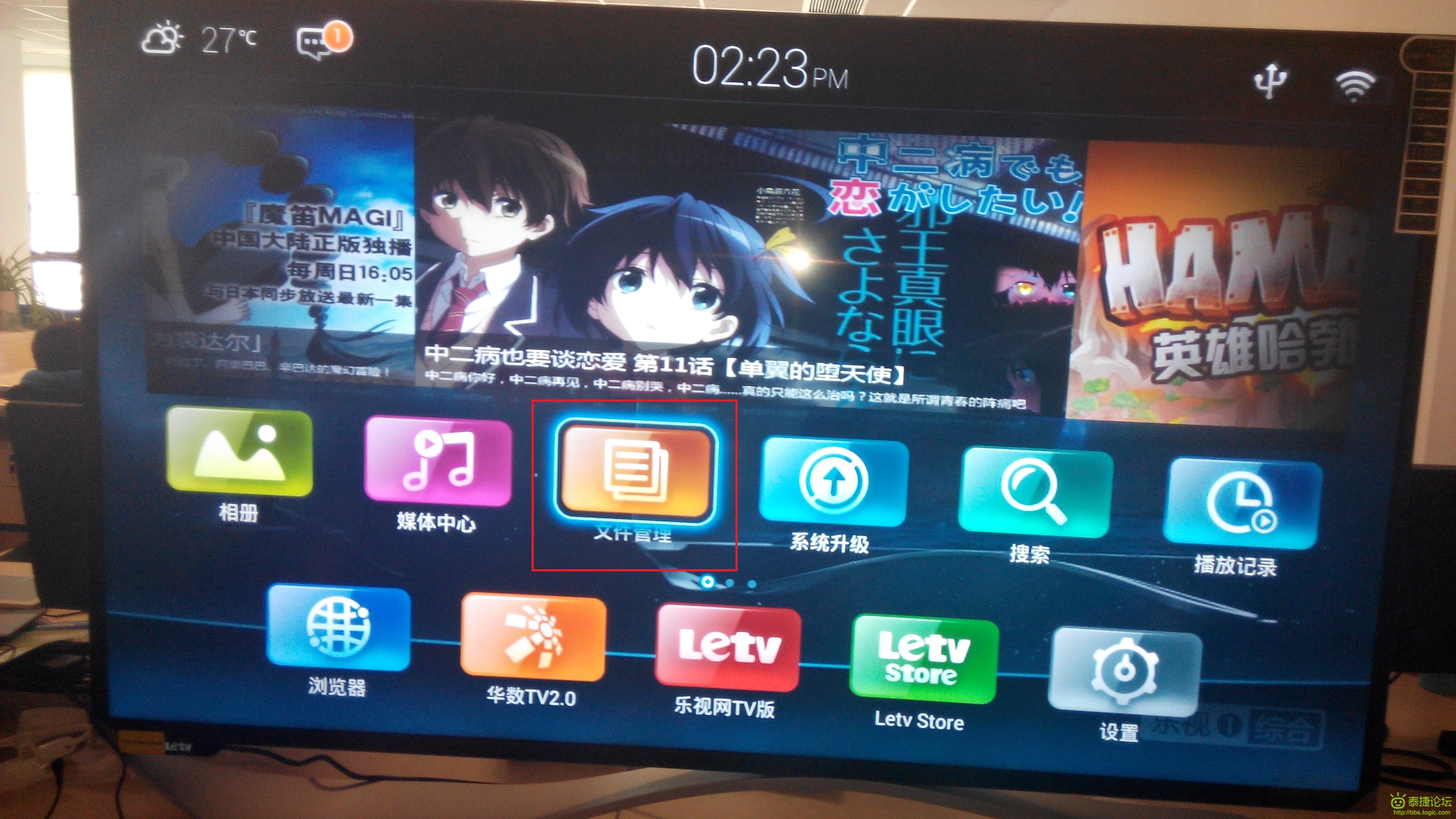 2.打開樂視X60電視,插入剛才的U盤,按遙控器“主頁”鍵,找到“文件管理”