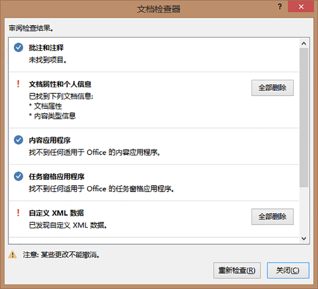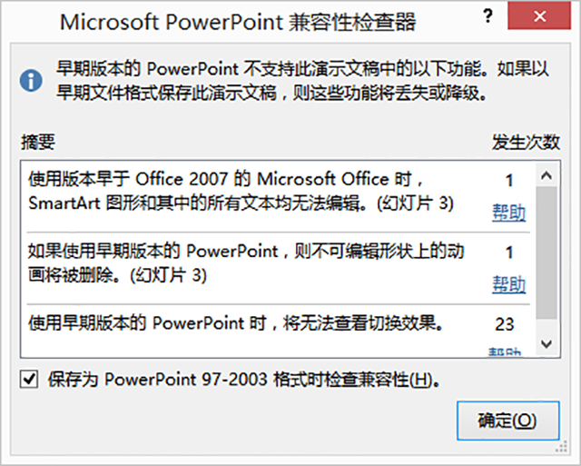 同樣點擊文件>信息>檢查問題,有三個選項,分別可以提示殘障人士無法閱讀的內容、檢查文件內各要素對office 97~03版本(也就是.ppt)的支持,刪除文檔中個人信息(不會損害文件要素)。
