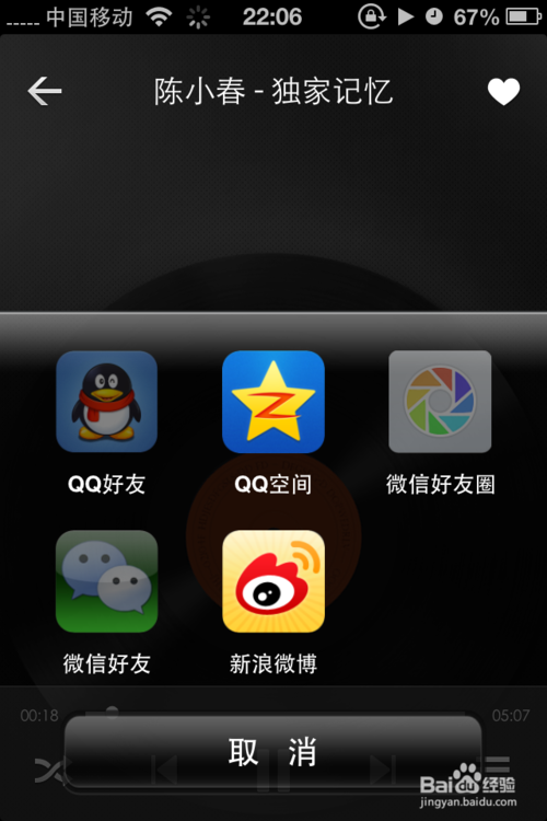 4、之后點擊空白處,就會彈出分享層,點擊分享按鈕,會彈出菜單,讓你選擇分享到哪里,目前舊版的酷狗音樂支持分享到 QQ QQ空間 微信 新浪微博 和朋友圈,但新版的好像屏蔽了分享的朋友圈的權限