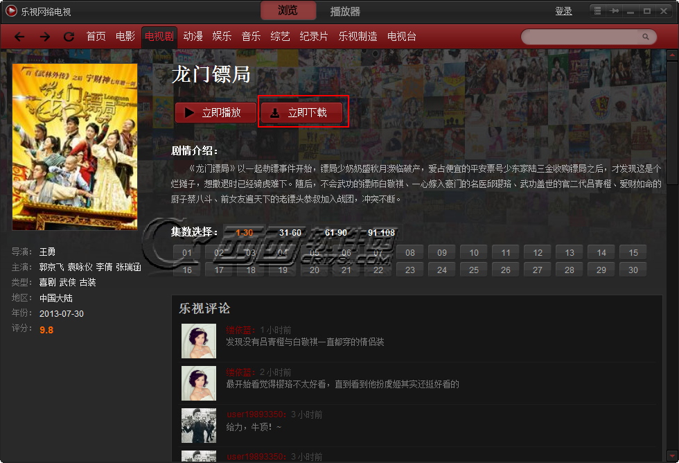 4、點(diǎn)擊視頻介紹頁(yè)面的立即下載,如果是電視劇的話會(huì)有個(gè)劇集選擇,一般的電影動(dòng)漫之類(lèi)的視頻則會(huì)讓你選擇清晰度,