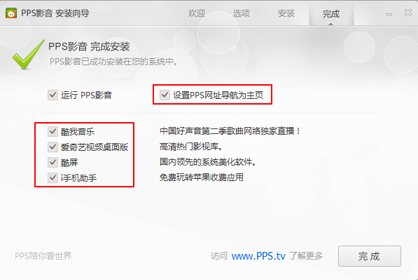 1、下載PPS影音并安裝程序,安裝PPS的時候會捆綁安裝PPS游戲中心,這個不需要桌面快捷方式就勾掉。