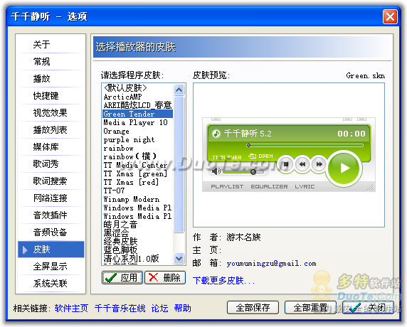 新版的千千靜延續(xù)了以往隱顯結(jié)合的視覺(jué)效果和華麗的界面風(fēng)格,默認(rèn)的淡藍(lán)色皮膚也顯得素雅大方、不失時(shí)尚。當(dāng)然,您還可以按照自己的喜好更換皮膚:“千千靜聽(tīng)”自帶了多種精美皮膚,只需右擊窗口內(nèi)任意位置,點(diǎn)“選項(xiàng)”在“皮膚”中選擇您喜歡的樣式,點(diǎn)擊“應(yīng)用”即可。