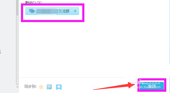 6、點擊此群后,此群的名稱就出現在右側的空白處,如果選擇好友,好友的昵稱就會出現在這里,然后點擊右下角的"發送”。