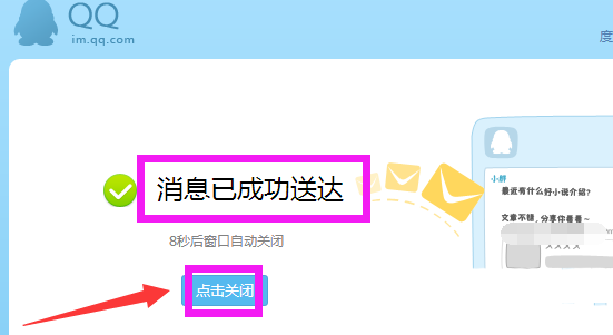 8、這時會看到一個消息提示窗口,告訴你消息已成功送達,點擊關閉即可,如不點擊關閉,幾秒后窗口會自動關閉。