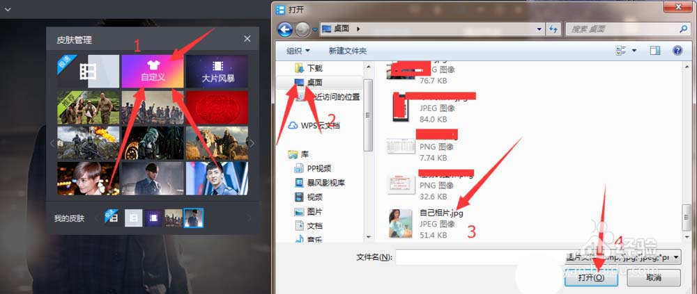 6、也可以把自己的相片作為皮膚哦,點擊”自定義“,最好先把自己相片放到桌面。就以下圖所示: