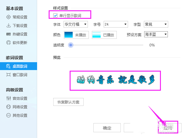 7、點擊【單行顯示歌詞】。沒點擊前,預覽效果如圖。