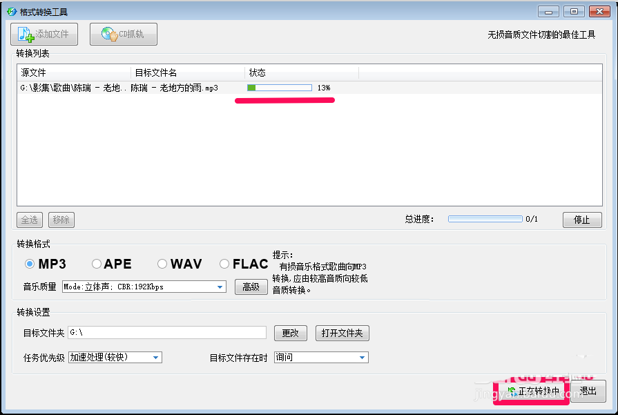 6、此時需要轉換的歌曲便顯示在格式轉換工具窗口的轉換列表中。點擊:轉換格式【MP3】,確定目標文件夾,【任務優先級】我們可以選擇:加速處理或資源優先,【目標文件存在時】可以選擇:重命名、詢問或覆蓋,最后點擊:轉換文件;