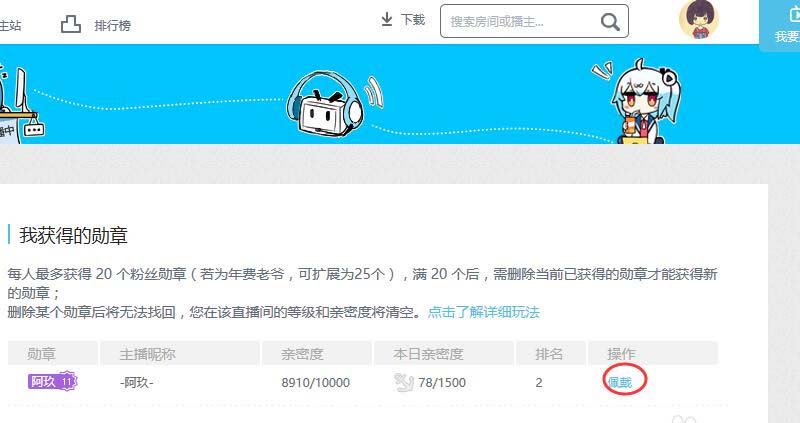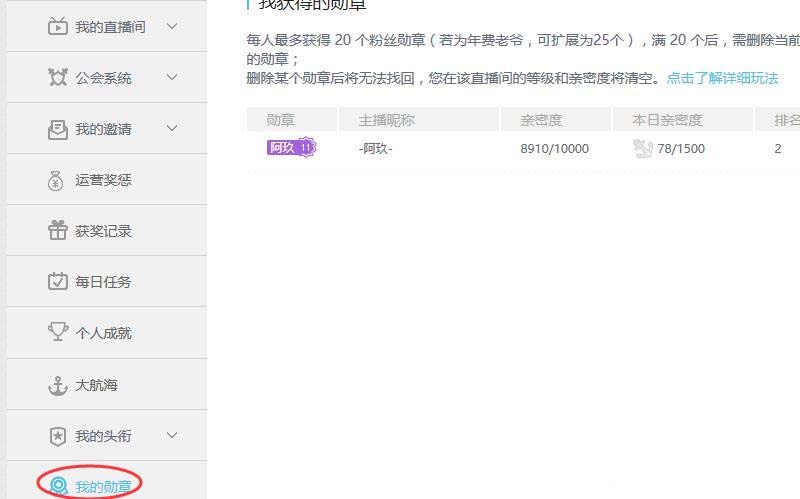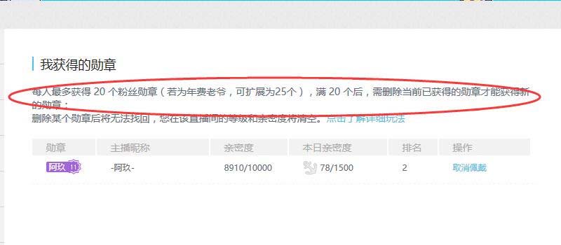 3、普通用戶的主播徽章默認(rèn)獲取量是20個(gè),若為年費(fèi)老爺,可擴(kuò)展為25個(gè)。若刪除某個(gè)勛章后將無法找回,且在該直播間的等級(jí)和親密度將清空。