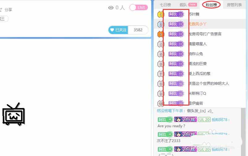 2、打開直播間,在右側(cè)有個(gè)粉絲榜的切換菜單,點(diǎn)擊之后,就會(huì)顯示出該主播的粉絲排行,以及佩戴的主播徽章;
