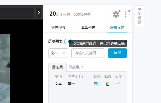 4、然后就可以看到已經(jīng)添加該關(guān)鍵字了,而且已經(jīng)同步到云端,我們在手機客戶端使用b站看視頻時也會自動屏蔽該關(guān)鍵字