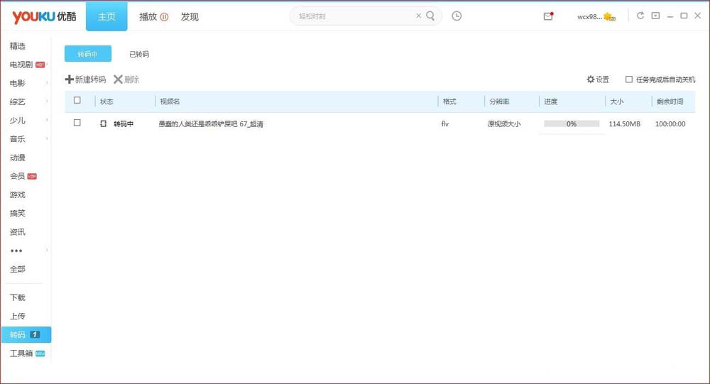 3、接下來在優(yōu)酷客戶端中點(diǎn)擊主頁,然后點(diǎn)擊轉(zhuǎn)碼,然后點(diǎn)擊上方的新建轉(zhuǎn)碼(見圖)。