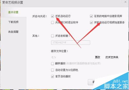 2、在打開的愛奇藝視頻設(shè)置窗口中,取消掉“開機自動運行”與“開機自動運行視頻加速服務(wù)”前的兩個復(fù)選框