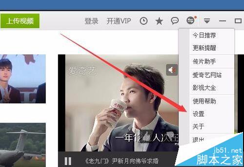 1、在打開的愛奇藝客戶端,點擊右上角的選項按鈕,在彈出菜單中點擊“設(shè)置”菜單項