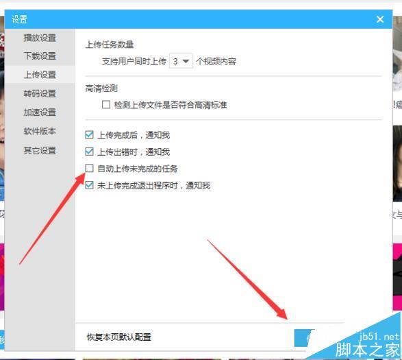 6、在上傳設置選項卡的右側窗格,找到“自動上傳未完成的任務”選項,并將此選項取消勾選,再點擊“保存”按鈕。如圖所示;