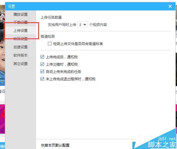 5、在設置對話框中,選擇左側窗格中的“上傳設置”選項卡。如圖所示;