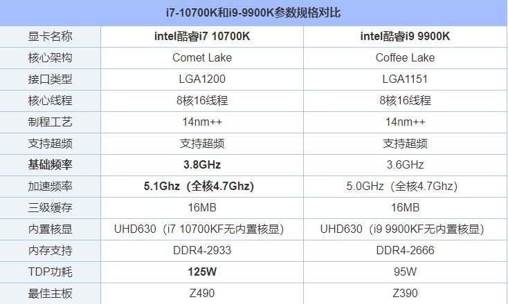老規矩,首先我們來看看i7 10700K和i9-9900K兩者參數對比,先初步來了解一下兩款CPU的性能差異,來看看如下參數對比表格。