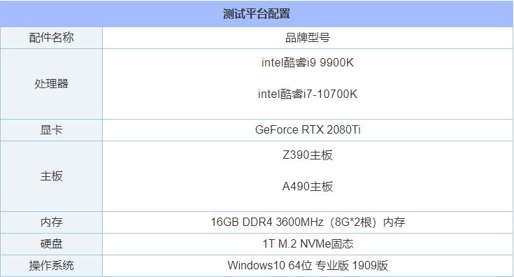 測試平臺電腦配置方面,i9 9900K配Z390主板和i7-10700K配Z490主板,CPU保持默認頻率,其它硬件保持一致,顯卡方面我們選用了RTX2080Ti,配備雙8G DDR4 3600Mhz頻率組建的16G雙通道內存,1T M.2 NVMe固態,Windows10 64位1909版專業版系統,測試成績結果可能受硬件、系統、軟件版本等變化會有出入,僅供參考。