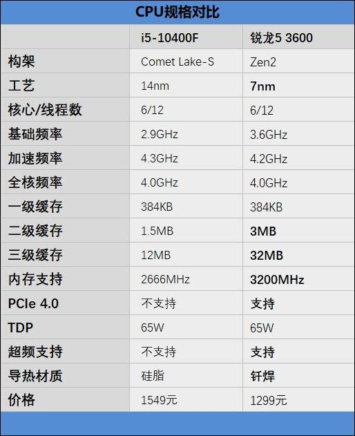 銳龍5 3600和酷睿i5-10400F區別對比: