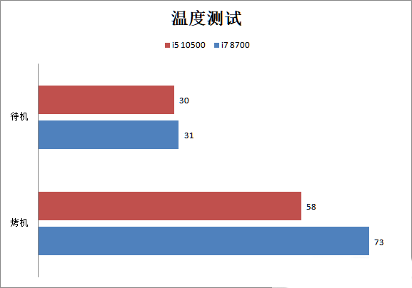 溫度和功耗方面,i5 10500的表現非常好,尤其是在烤機時,i5 10500的烤機溫度只有58度,功耗也只有123W。而i7 8700的烤機溫度為73度,功耗也來到了176W。因此在溫度、功耗方面i5 10500完勝i7 8700。