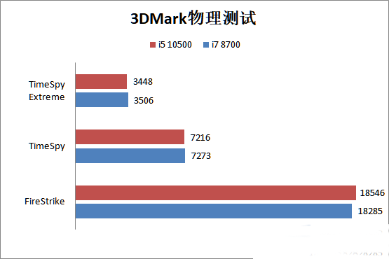 3DMark物理測試環節中,i5 10500在FireStrike的小項目中反超了i7 8700。不過TimeSpy和TimeSpy Extreme這兩項的成績還是稍微落后于i7 8700。
