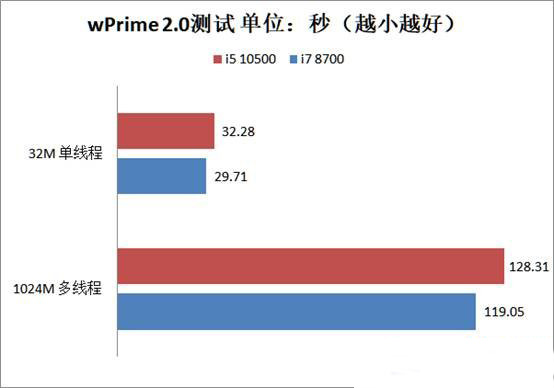 在wPrime 2.0測試中,主頻較低的i5 10500依然沒能反超i7 8700。