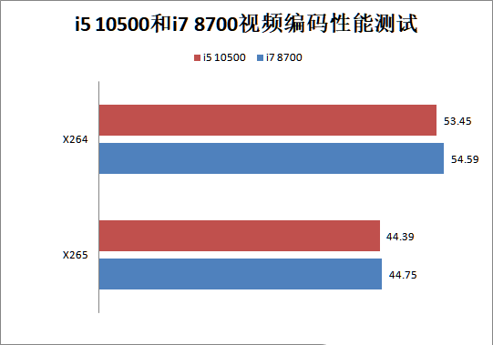 x264以及x265是兩個老牌開源編碼器,應用相當廣泛,這次我們使用了新版本的Benchmark,它能更好的支持AVX 2指令集。這個測試項目里邊依舊是i7 8700略勝i5 10500,不過差距非常小。