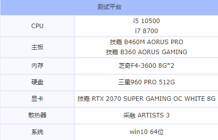 由于i5 10500和i7 8700的接口類型完全不同,所以測試平臺選用了兩款主板,分別是技嘉 B460M AORUS PRO對應i5 10500,技嘉 B360 AORUS GAMING對應i7 8700,其它配件見下表