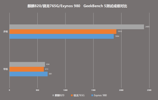 先是CPU部分,選用Geekbench 5進行測試,單核成績中,擁有A77大核的Exynos 980以681的成績領先,其后依次是麒麟820與驍龍765G。而在多核成績中,麒麟820以2405的大比分領先,驍龍765G也實現了對Exynos 980的小幅反超。