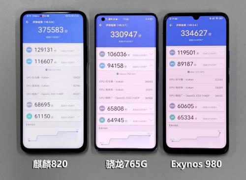 相對綜合性更全面一些的安兔兔也是重要參考依據,直接看總分的話麒麟820、驍龍765G、Exynos 980安兔兔V8版得分情況分別為375583、330947、334627,驍龍765G與Exynos 980相差無幾,麒麟820則把它們甩開了一定距離。