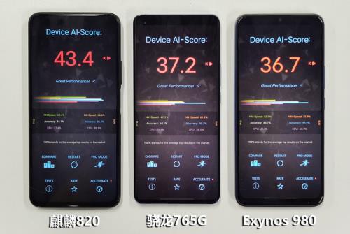 細分四個類別來對比三款平臺的差異,可以看到在CPU、GPU、內存三方面麒麟820都穩居第一,UX部分稍顯拉跨,比驍龍765G和Exynos 980稍差一些,如果之后測試的固件版本有相應優化,總成績應該還會有一定提升。