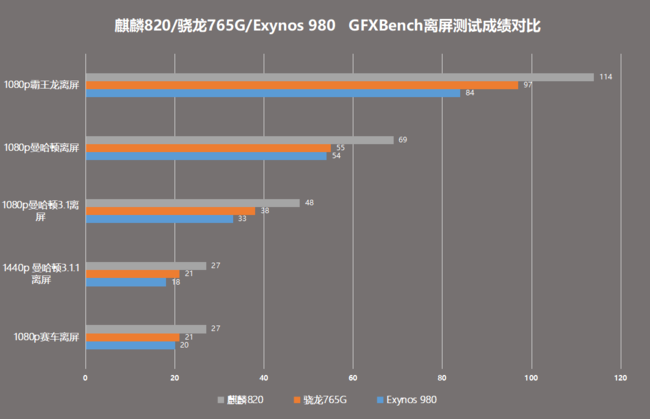 實際上GFXBench成績的趨勢與3DMark是基本相同的,麒麟820的圖形能力相比另外兩個平臺要明顯強出一截,在所有測試項目中都位居第一,驍龍765G的Adreno 620則排在第二,Exynos 980的Mali-G76 MP5在對比之下稍遜一籌。