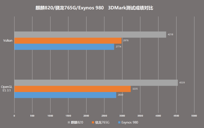 GPU我們選用3DMark和GFXBench兩款軟件進行測試,首先是3DMark Sling Shot Extrme測試,OpenGL ES 3.1和Vulkan版本中三款芯片的排序其實并沒有差別,麒麟820大幅領先其余二者,而驍龍765G相對Exynos 980也有著較為明顯的優勢。
