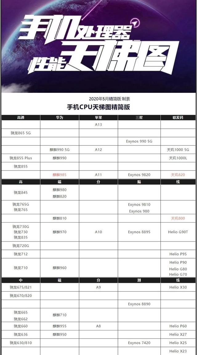 為了更為直觀的了解麒麟820和天璣820的性能排名關系,最后附上一張這兩款Soc在手機CPU天梯圖精簡版中的排名,供大家參考下。