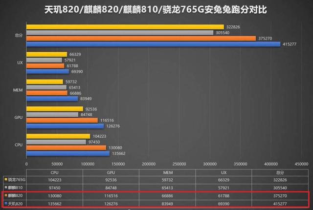 接下來,我們來看下麒麟820和天璣820安兔兔跑分對比,綜合來看,麒麟820跑分在37.5萬分左右,而天璣820跑分在41.5萬分左右,跑分上高了大約4萬分。