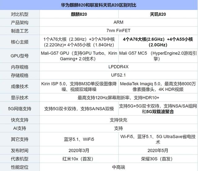 作為一篇技術類分析文章,參數對比自然少不了。下面首先來看看麒麟820和天璣820的規格對比,具體區別如下: