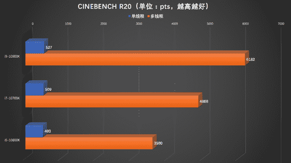 運(yùn)行CINEBENCHR20測(cè)試,i9-10900K單線程成績(jī)?yōu)?27pts,多線程成績(jī)?yōu)?182pts;i7-10700K單線程成績(jī)?yōu)?09pts,多線程成績(jī)?yōu)?868pts;i5-10600K單線程成績(jī)?yōu)?93pts,多線程成績(jī)?yōu)?580pts。