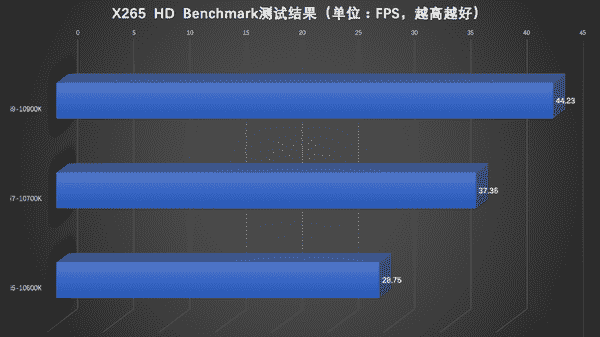 運(yùn)行X265HDBenchmark測(cè)試結(jié)果如下,i9-10900K成績(jī)?yōu)?4.23FPS;i7-10700K成績(jī)?yōu)?7.36FPS;i5-10600K成績(jī)?yōu)?8.75FPS。