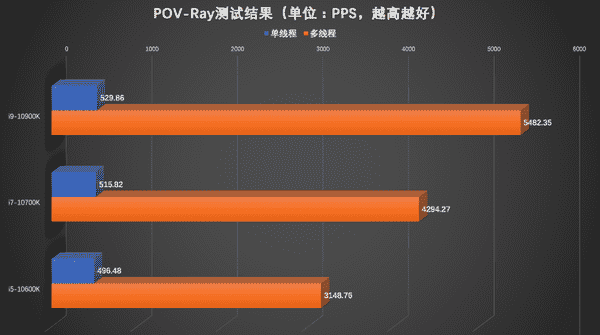 PersistenceofVisionRaytracer(POV-Ray)是一款高質(zhì)量的免費(fèi)軟件工具,用于創(chuàng)建炫目的三維圖形,可進(jìn)行CPU單線程及多線程的3D光線追蹤性能評(píng)測(cè),測(cè)試結(jié)果為渲染平均PPS(每秒像素?cái)?shù))。此項(xiàng)測(cè)試結(jié)果為,i9-10900K單線程成績(jī)?yōu)?29.86PPS,多線程成績(jī)?yōu)?482.35PPS;i7-10700K單線程成績(jī)?yōu)?15.82PPS,多線程成績(jī)?yōu)?294.27PPS;i5-10600K單線程成績(jī)?yōu)?96.48PPS,多線程成績(jī)?yōu)?148.76PPS。