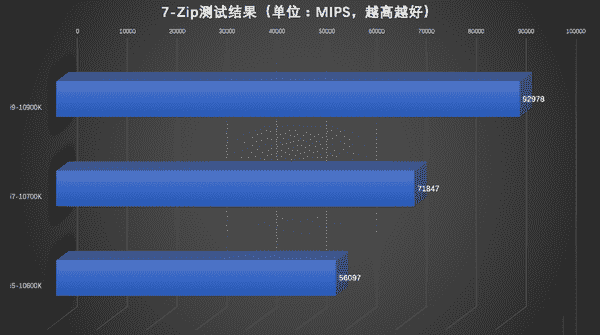 7-Zip是一款完全免費(fèi)而且開(kāi)源的壓縮軟件,相比其他軟件有更高的壓縮比但同時(shí)耗費(fèi)的資源也相對(duì)更多。運(yùn)行7-Zip的基準(zhǔn)測(cè)試,i9-10900K成績(jī)?yōu)?2978MIPS;i7-10700K成績(jī)?yōu)?1847MIPS;i5-10600K成績(jī)?yōu)?6097MIPS。
