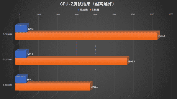 運(yùn)行CPU-Z測(cè)試,i9-10900K單線程成績(jī)?yōu)?00.2,多線程成績(jī)?yōu)?504.9;i7-10700K單線程成績(jī)?yōu)?83.2,多線程成績(jī)?yōu)?890.2;i5-10600K單線程成績(jī)?yōu)?55.1,多線程成績(jī)?yōu)?951.9。