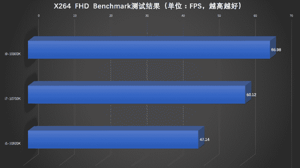 測(cè)試結(jié)果為,i9-10900K成績(jī)?yōu)?6.98FPS;i7-10700K成績(jī)?yōu)?0.12FPS;i5-10600K成績(jī)?yōu)?7.14FPS。