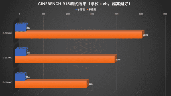 運(yùn)行CINEBENCHR15測(cè)試,i9-10900K單線程成績(jī)?yōu)?19cb,多線程成績(jī)?yōu)?609cb;i7-10700K單線程成績(jī)?yōu)?17cb,多線程成績(jī)?yōu)?046cb;i5-10600K單線程成績(jī)?yōu)?04cb,多線程成績(jī)?yōu)?470cb。