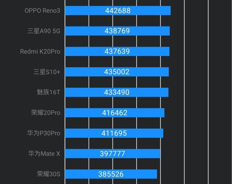 兩款芯片均集成5G基帶,支持雙模5G。上面的對比似乎還不夠直觀,那就直接來看安兔兔跑分吧。搭載天璣1000L的OPPO Reno3安兔兔跑分44W+,而搭載麒麟820的榮耀30S跑分為38W+。