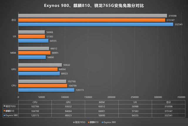 綜合來看,驍龍765G在GPU方面有優(yōu)勢(shì);麒麟810則在CPU上高于驍龍765G,但低于三星Exynos 980;而三星Exynos 980最大的亮點(diǎn)在于CPU,都高于驍龍765G和麒麟810,但在MEM方面差距很大。