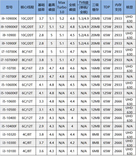 十代酷睿桌面端cpu型號一覽